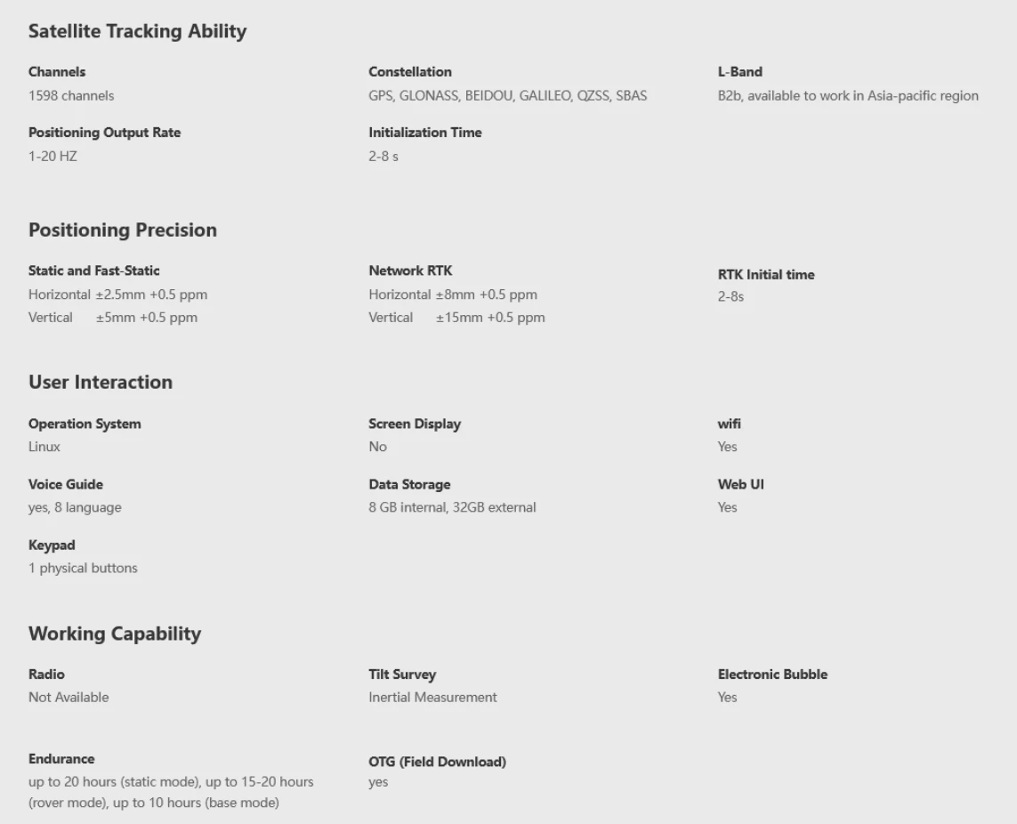Zahvaljujući dizajnu operativnog sustava niske potrošnje, K7 može raditi do 15-20 sati u RTK rover načinu rada, do 20 sati u statičkom načinu rada. Type-C USB priključak je sada uključen.